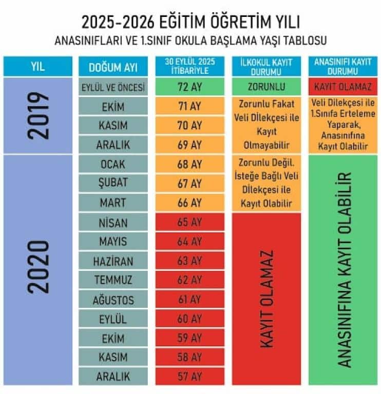 2025-2026 Eğitim Öğretim Yılı Anasınıfları ve 1. Sınıf Okula Başlama Yaşı Tablosu